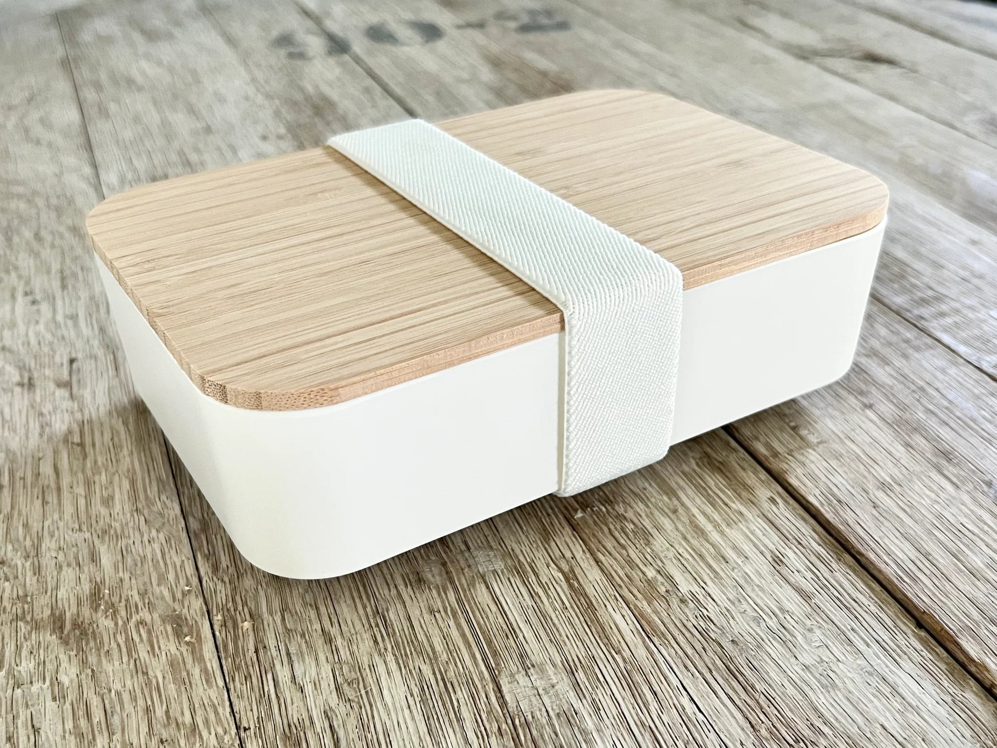 This 28oz bento lunch box w/genuine bamboo wood air tight lid. Comes with 3.1cm removable woven band to hold lid in place during travel. Biodegradable - made with bamboo fiber and cornstarch. No plastic ingredients or pesticides used in the making of this product. Container (without lid) is dishwasher safe. Approximate dimensions: Box size is 7.3” x 5” x 2.3” (28oz)