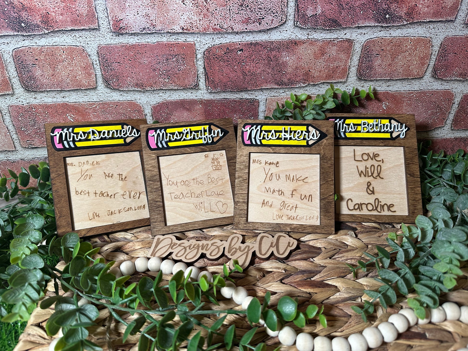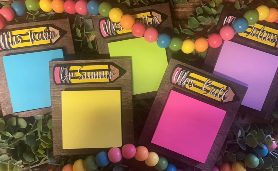 Stay organized and make your notes pop with our personalized Post It Note holders! Perfect for teachers, keep track of important reminders in a fun and unique way. The ultimate gift for educators (or yourself) to add some personal flair to your desk. If you choose to have your child's handwriting included- just have him/her write a simple message using black ink on a plain white sheet of paper without lines. Then snap a pic and send it to us on our Facebook page (Designs by CiCi) or email it to designsbycici3@gmail.com